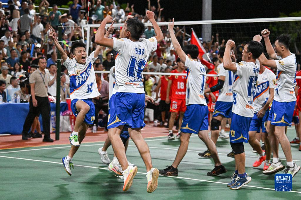 東郊鎮隊隊員在“村排”決賽中戰勝東閣鎮隊后慶祝(8月13日攝)。