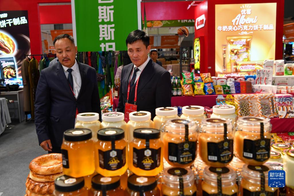 8月17日,來自吉爾吉斯斯坦的客商在2023(中國)亞歐商品貿易博覽會上查看本國產的蜂蜜。