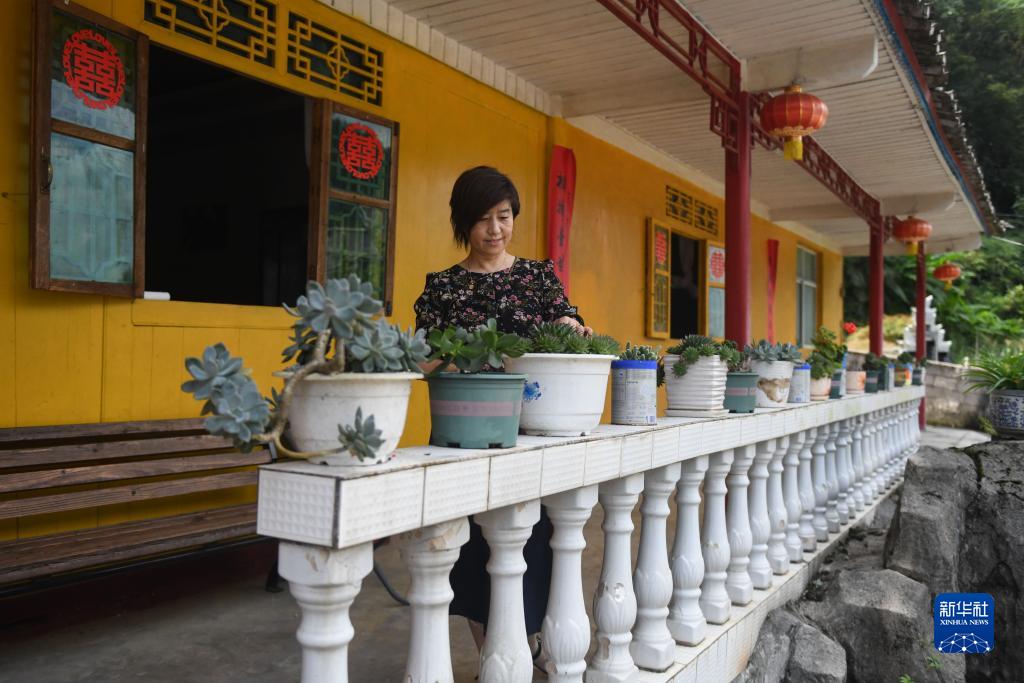 下坪鄉(xiāng)東洲村村民李雙銀在自家的“魯家大院”里整理花草(8月17日攝)。