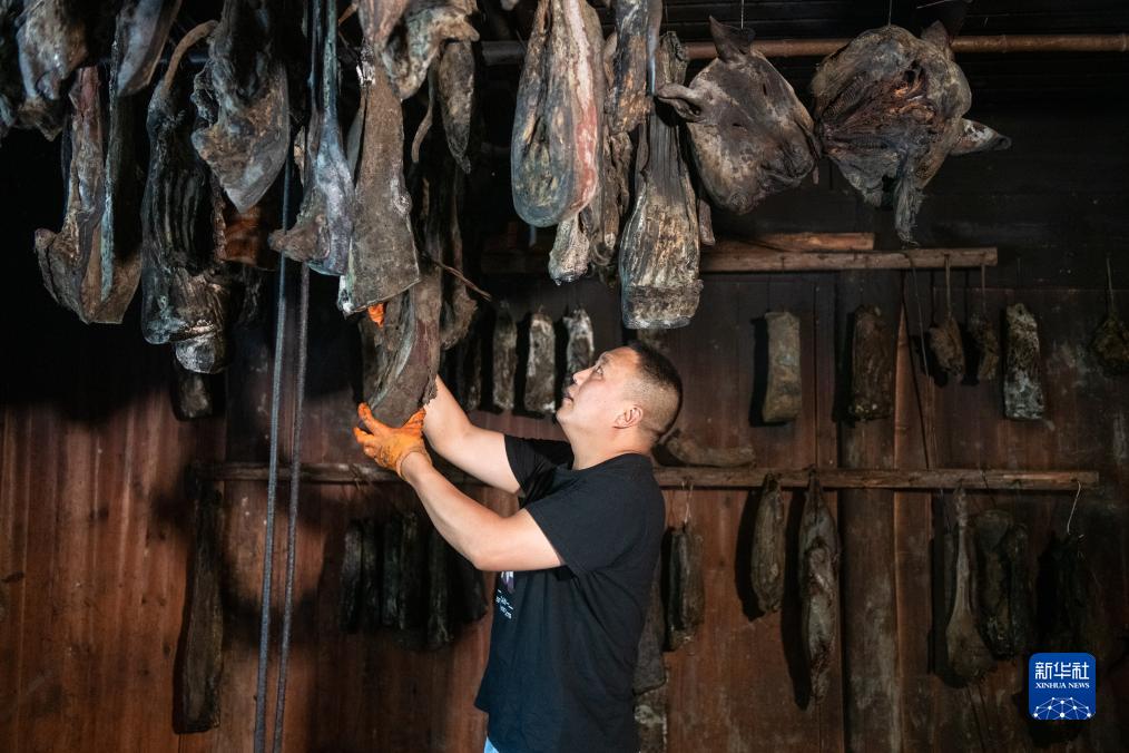 下坪鄉東洲村村民田一民在家中整理臘肉(8月17日攝)。田一民和兩個兄弟一起,圍繞自家的院落,打造“三兄弟臘肉”土特產品牌,并通過網絡把村里的土家臘肉、茶葉等特色農產品賣出大山。