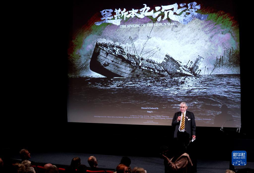8月15日,在英國倫敦,長期致力于收集整理“里斯本丸”號事件資料的英國退役軍官費恩祺在放映活動上發言。