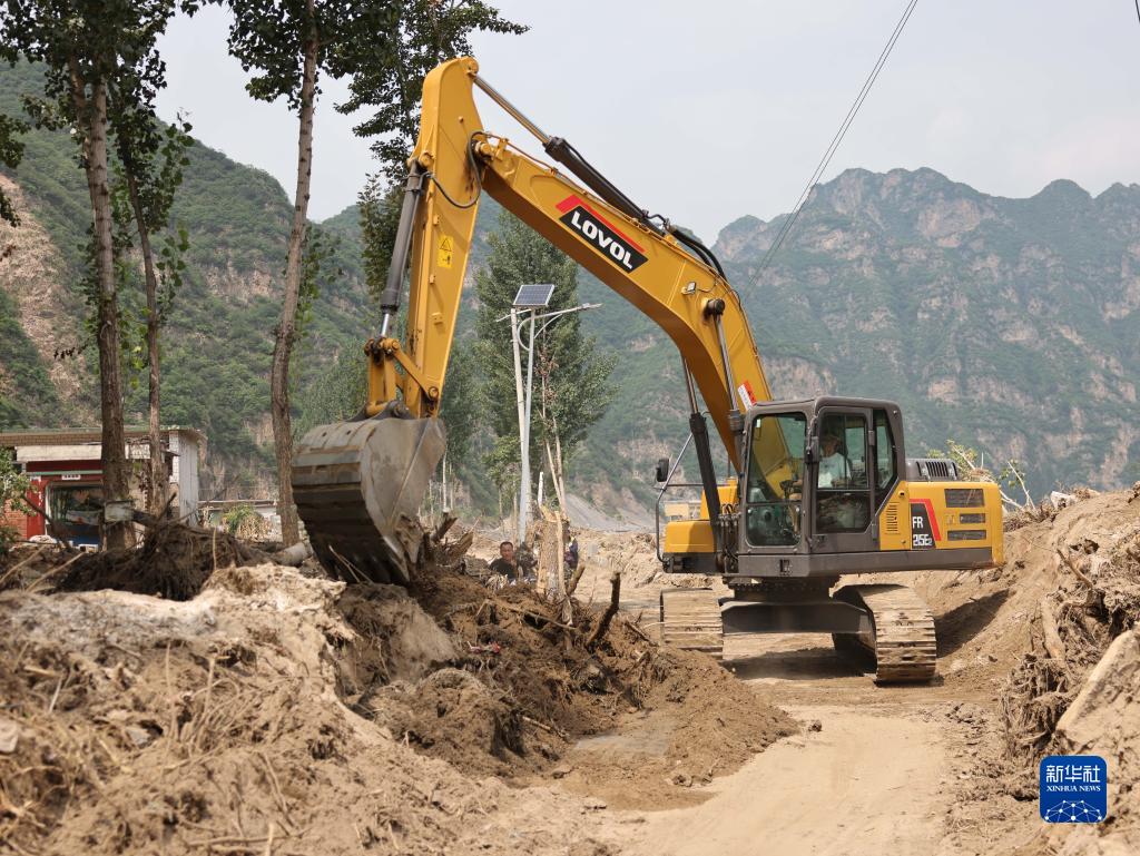 8月17日,工作人員駕駛機(jī)械在河北省保定市淶水縣趙各莊鎮(zhèn)平峪村清理進(jìn)村道路。