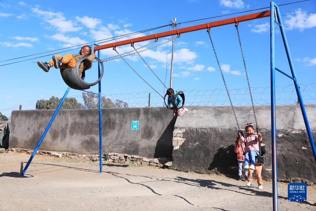 8月11日,孩子們在南非德阿鎮(zhèn)的一家兒童早教中心蕩秋千。