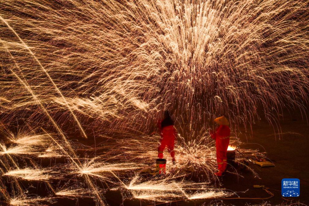 連日來,內蒙古伊金霍洛旗鄂爾多斯文化產業園在景區舉辦“華夏鐵魂”主題鐵花秀活動,民間藝人將燒紅的鐵水在半空中散開,迸濺形成萬千火花,構成壯麗的圖景,成為當地夜經濟的亮點,吸引眾多游人前來觀賞?;顒訉⒊掷m到8月27日。