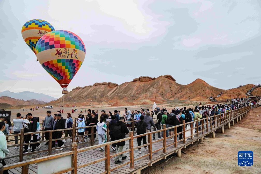 當日,甘肅張掖第三屆張掖七彩丹霞熱氣球嘉年華在七彩丹霞景區拉開帷幕。來自全國各地的熱氣球運動員駕乘熱氣球,在七彩丹霞上空進行飛行表演,上演熱氣球與丹霞的美麗邂逅。