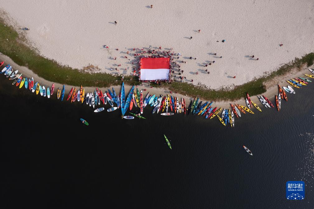 8月17日,在印度尼西亞雅加達安卒海灣,水上運動愛好者展開印尼國旗,慶祝獨立日(無人機照片)。