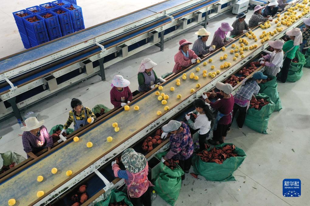 8月17日,村民在貴州省貴定縣德新鎮(zhèn)新鋪村黃桃種植基地的車間分揀黃桃。