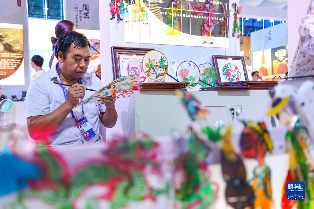 8月17日,參展商在云南騰沖皮影展位上繪制皮影。