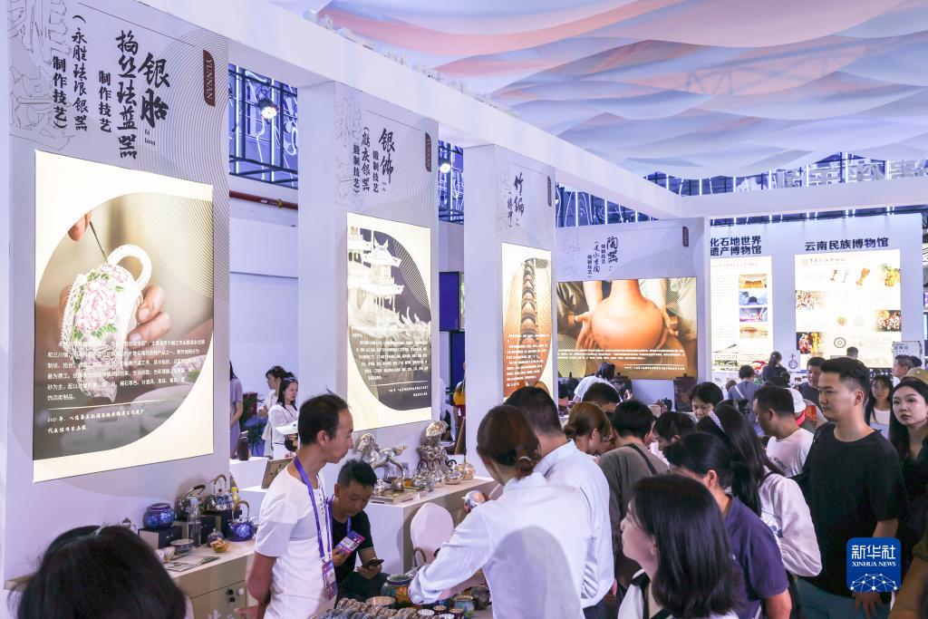 8月16日,第七屆中國—南亞博覽會在云南昆明開幕。在南博會的云南非遺伴手禮展區,皮影、銀器、陶器、木雕、竹編等特色非遺文化產品吸引了參觀者的關注。