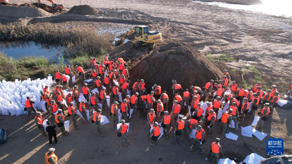 北部戰區陸軍某旅組織官兵在榆樹市拉林河青山段進行堤壩加固作業(8月16日攝)。