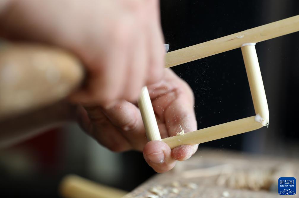 8月17日,崔凱在遼寧省營口市自己家中打磨吉祥輪彩紙風(fēng)車骨架。