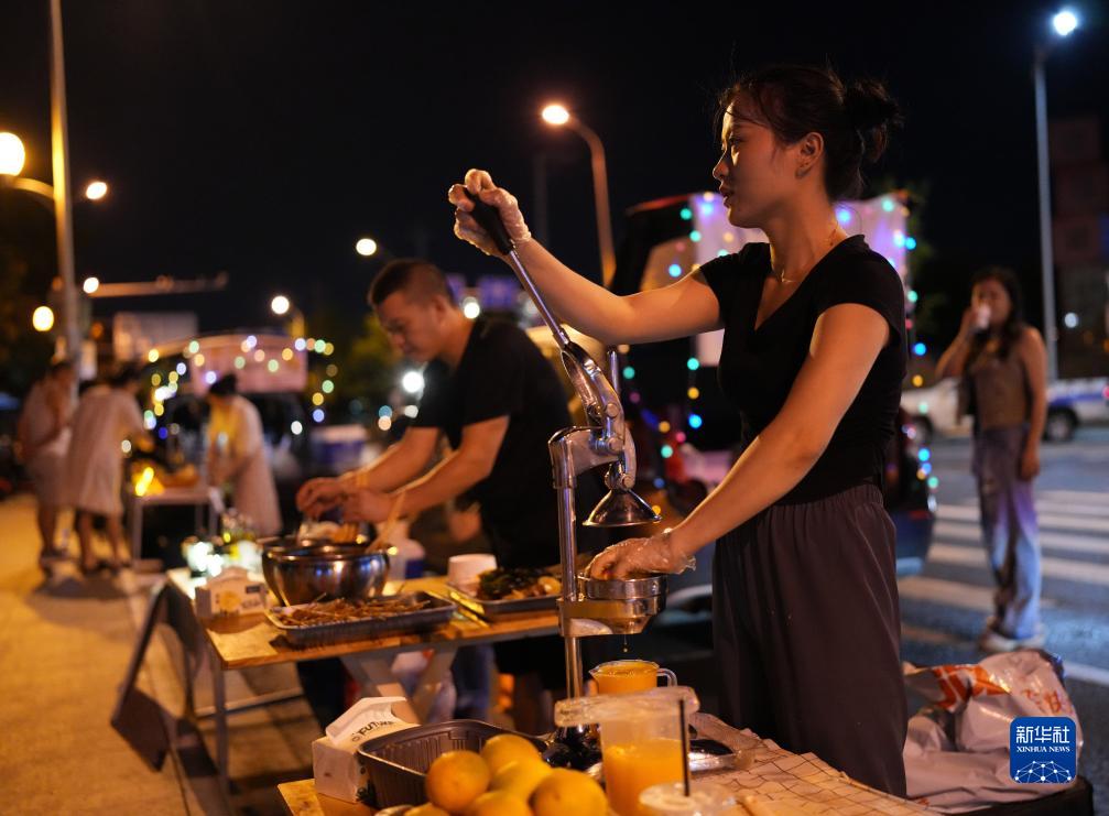 8月17日,浙江省紹興市越城區(qū)五云北路后備箱集市一名攤主為顧客榨果汁。