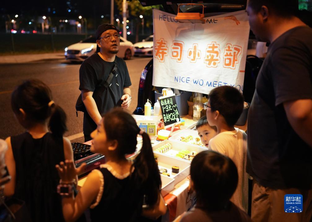 8月17日,浙江省紹興市越城區(qū)五云北路后備箱集市一名攤主在售賣壽司。