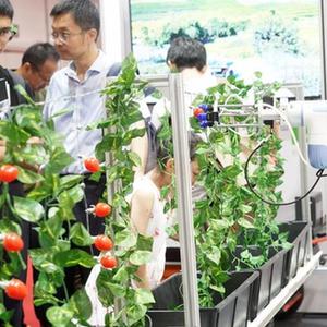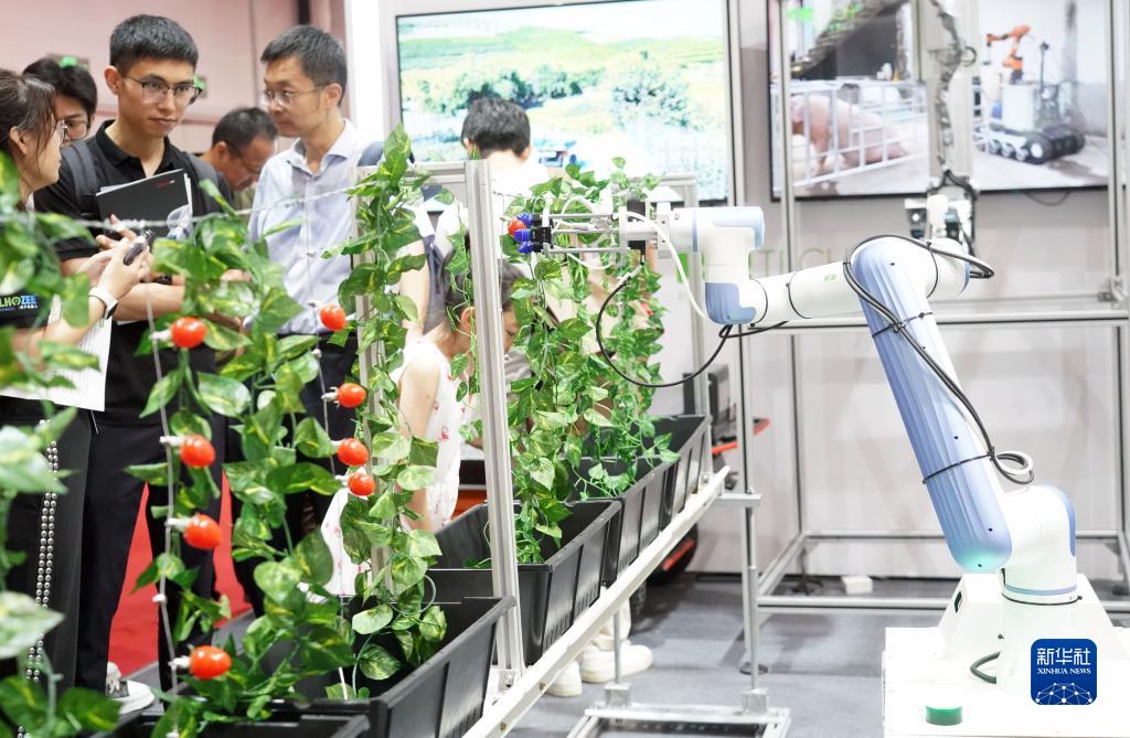 這是在2023世界機(jī)器人大會(huì)現(xiàn)場(chǎng)拍攝的智能采摘機(jī)器人(8月17日攝)。