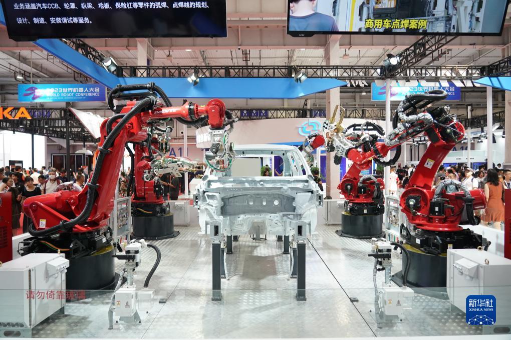 這是8月17日在2023世界機器人大會現場拍攝的白車身焊點機器人工作站。