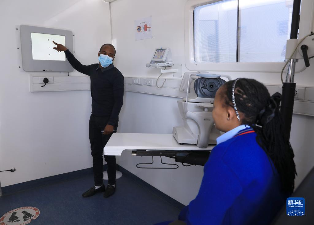 8月10日,在南非德阿鎮(zhèn)一所學校,學生在醫(yī)療大巴車上檢查視力。