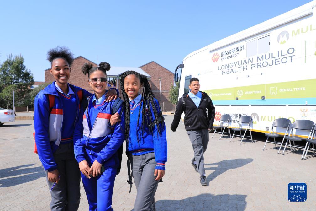 8月10日,在南非德阿鎮(zhèn)一所學(xué)校,學(xué)生在醫(yī)療大巴車前合影。