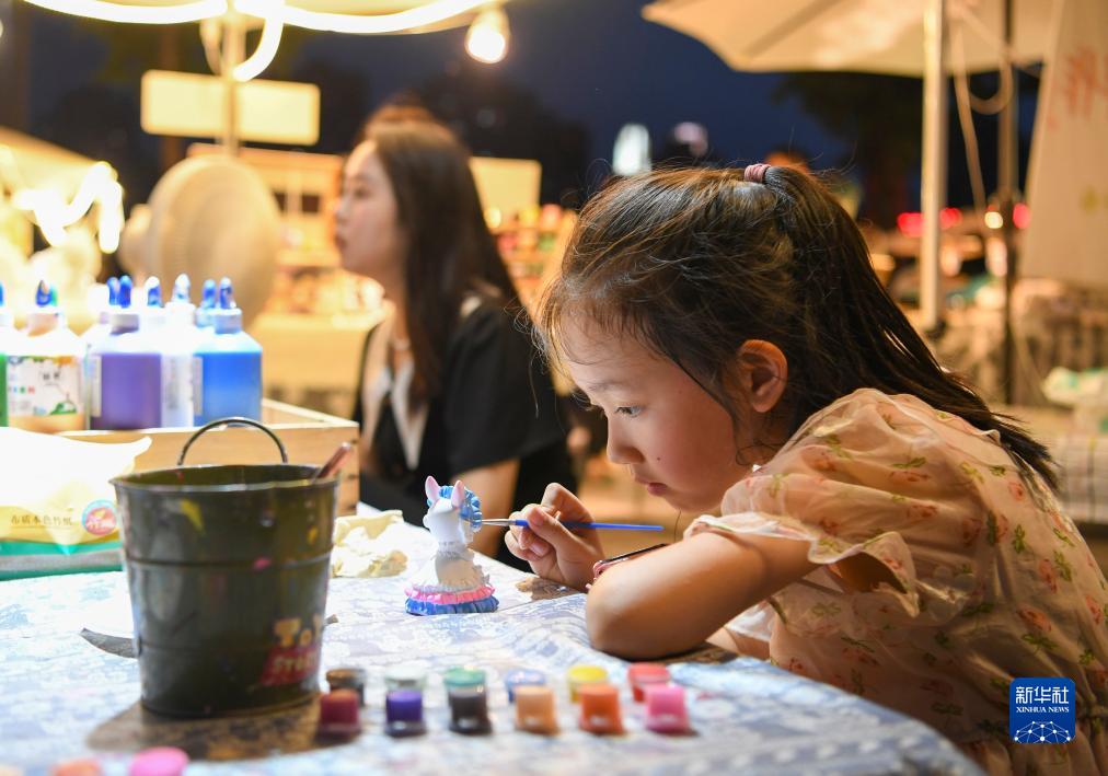 一名女孩在重慶市江北區鎏嘉碼頭的小熊集市體驗石膏娃娃制作(8月4日攝)。