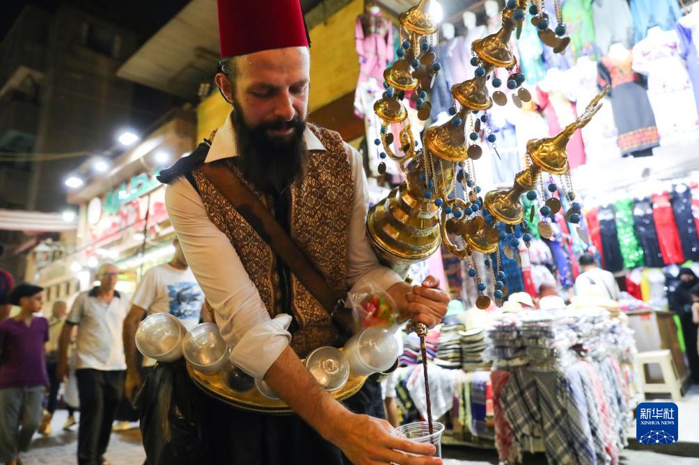 埃及開羅哈里里市場夜市的一名商販售賣涼飲(7月28日攝)。