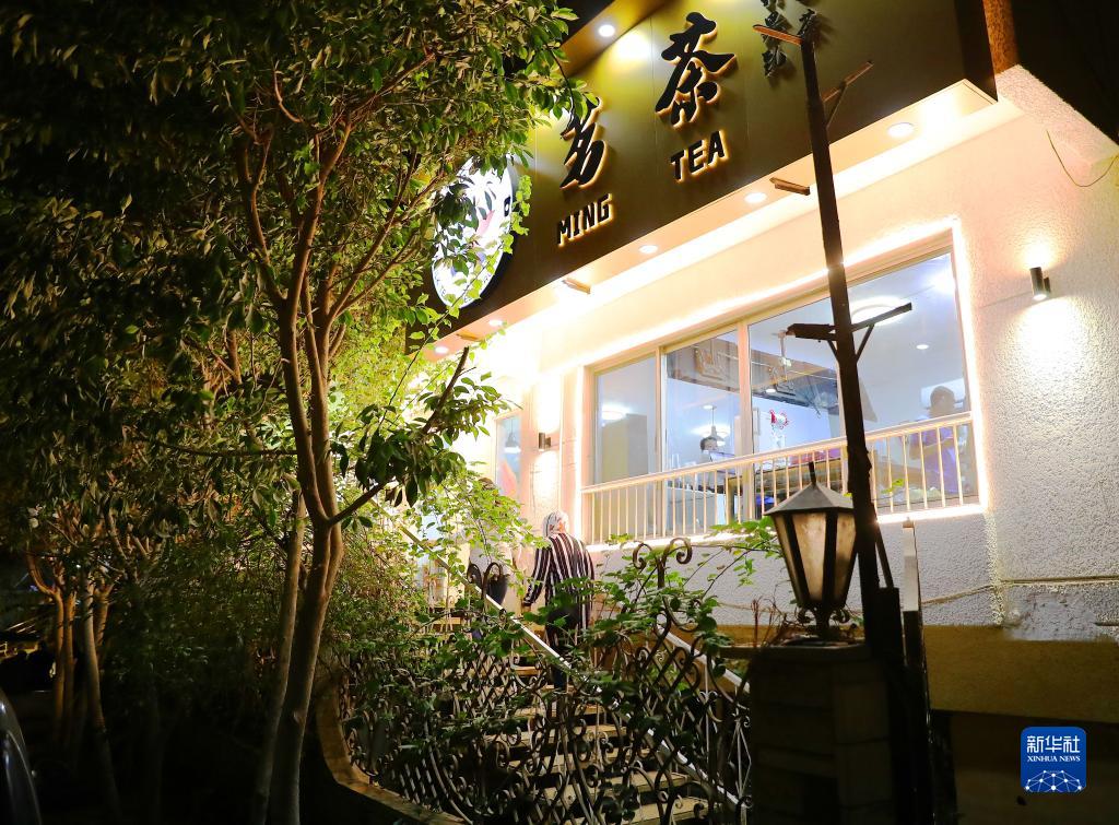 人們在夜間光顧埃及開羅的一家中國奶茶店(7月23日攝)。