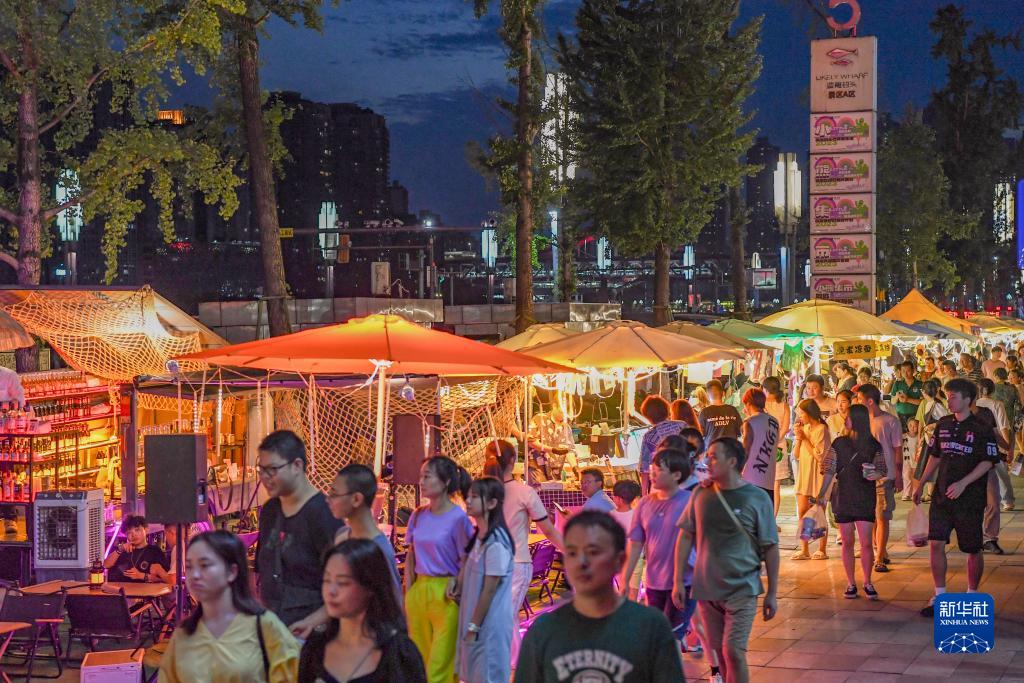 人們聚集在重慶市江北區(qū)鎏嘉碼頭的小熊集市(8月4日攝)。