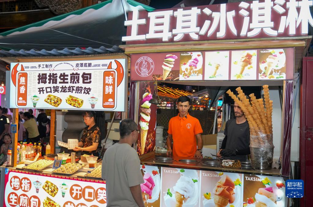 這是重慶洪崖洞夜市街區一處售賣土耳其冰淇淋的店鋪(右)(8月3日攝)。