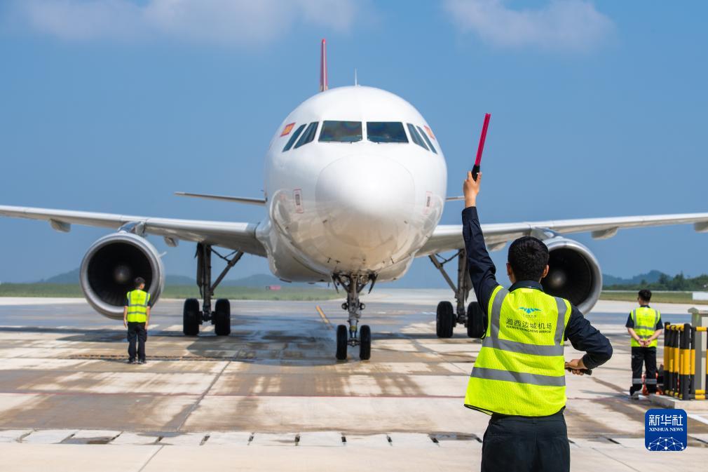 8月18日,湖南湘西邊城機場的地勤人員引導飛機進入停機坪。