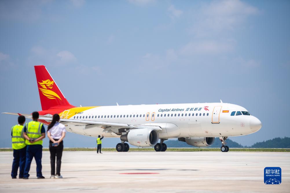 8月18日,湖南湘西邊城機場的地勤人員引導飛機滑行到跑道。