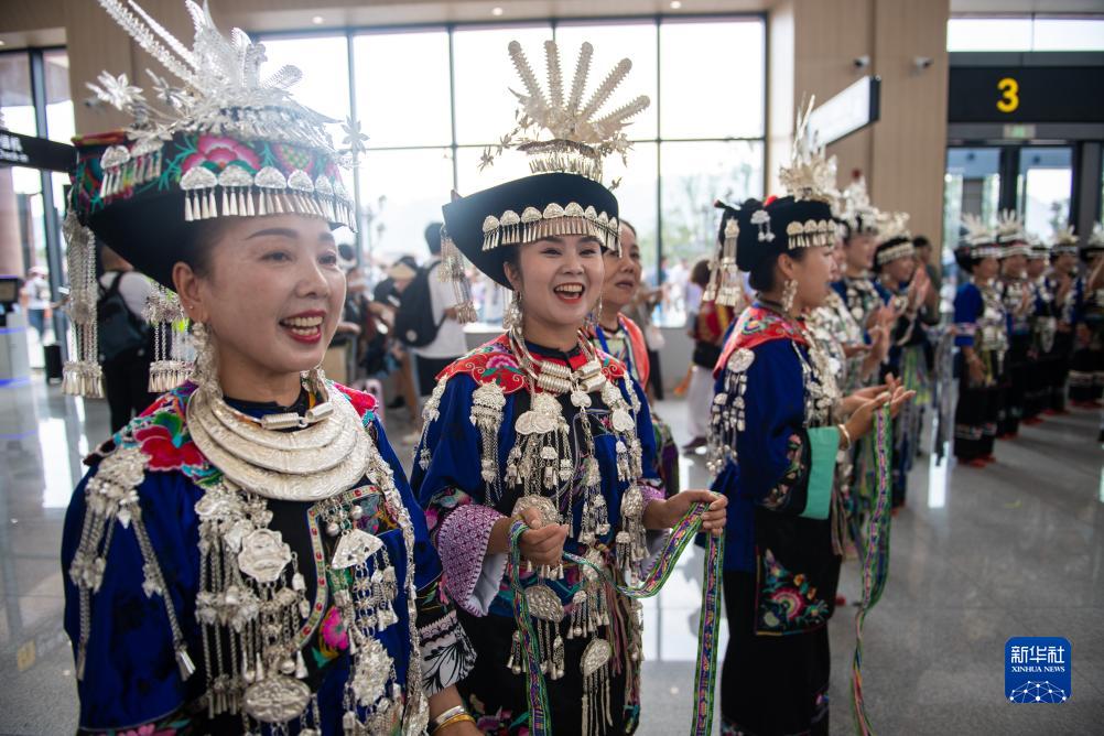 8月18日,當地群眾在湖南湘西邊城機場用傳統儀式迎接旅客。