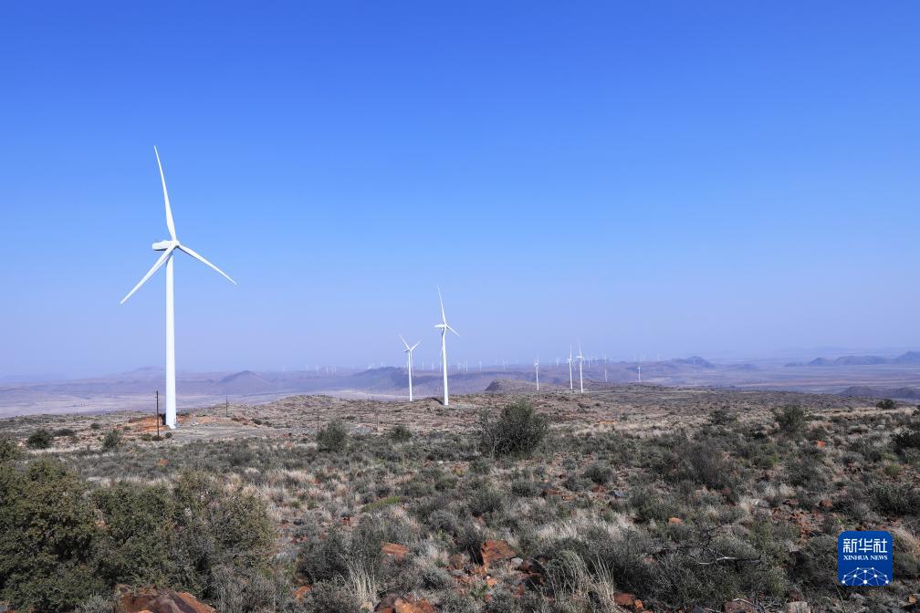 這是8月10日在南非北開普省德阿鎮拍攝的龍源南非公司德阿風電項目風機。