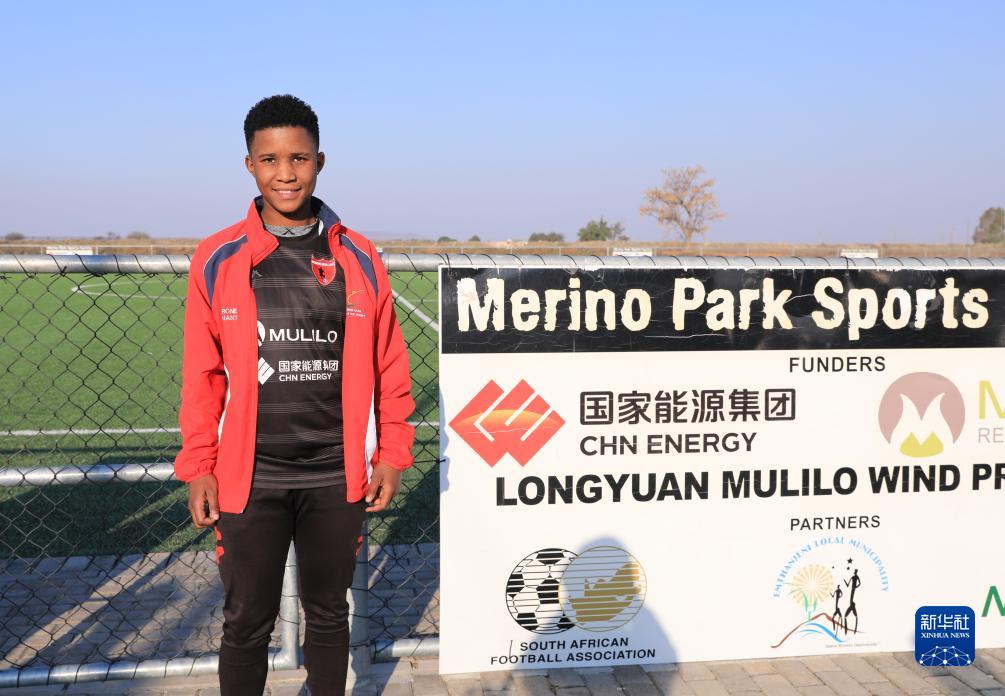 8月10日,在南非北開普省德阿鎮(zhèn),當?shù)嘏袑W生莎倫·奧利芬特在由龍源南非公司翻修一新的足球場邊接受采訪。