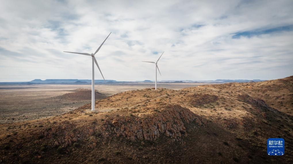 這是7月25日在南非北開普省德阿鎮(zhèn)拍攝的龍?jiān)茨戏枪镜掳L(fēng)電項(xiàng)目風(fēng)機(jī)。