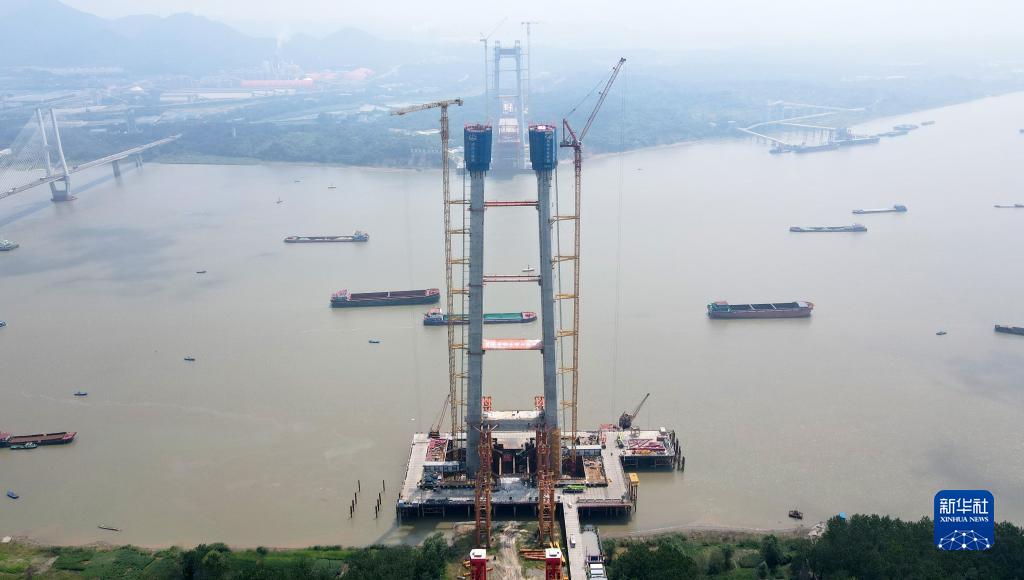 8月18日拍攝的建設中的京臺高速銅陵長江公鐵大橋,大橋南北兩座主塔完成封頂(無人機照片)。