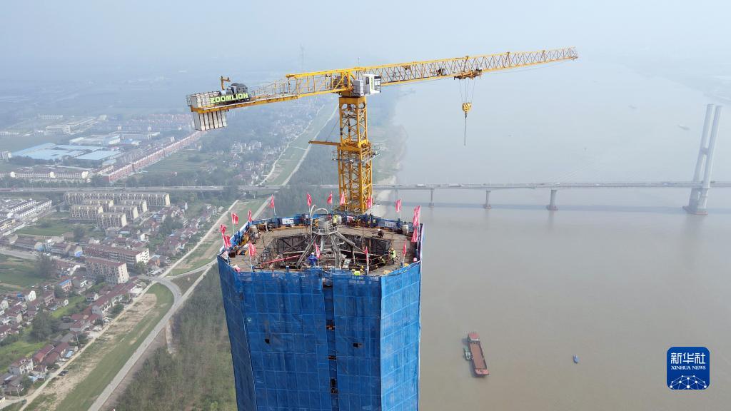 8月18日拍攝的京臺高速銅陵長江公鐵大橋3號主塔封頂施工現場(無人機照片)。