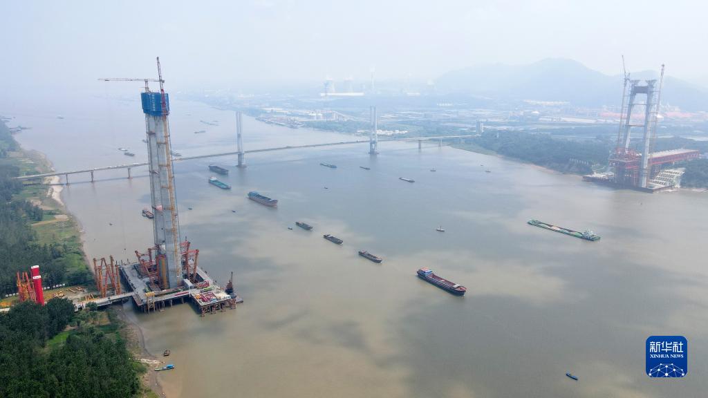 8月18日拍攝的建設(shè)中的京臺(tái)高速銅陵長(zhǎng)江公鐵大橋,大橋南北兩座主塔完成封頂(無(wú)人機(jī)照片)。