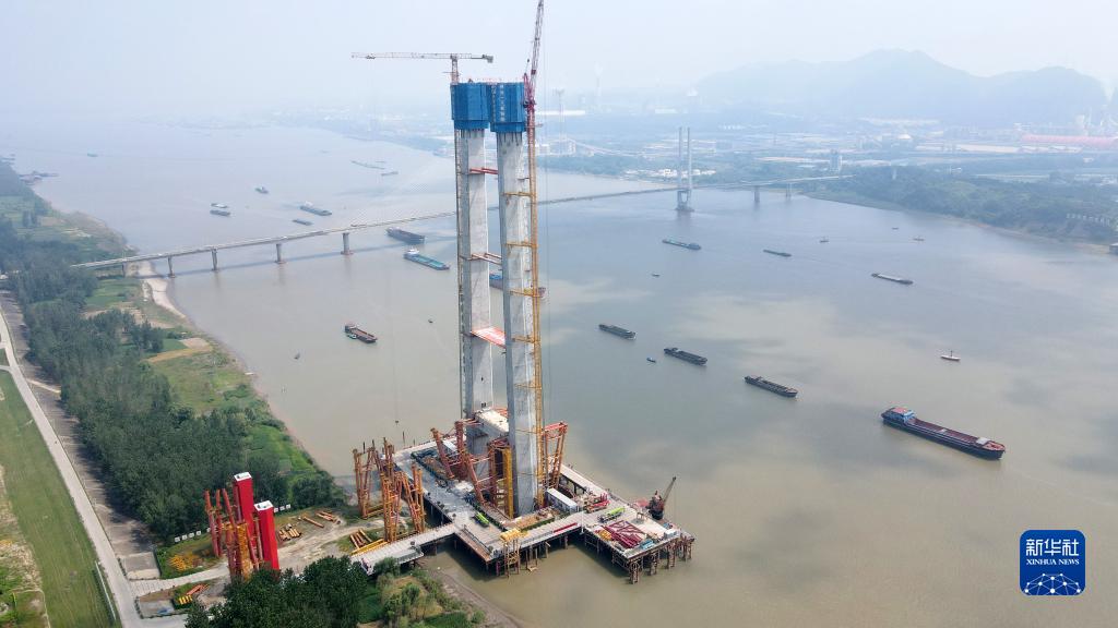 8月18日拍攝的封頂完成的京臺高速銅陵長江公鐵大橋3號主塔(無人機照片)。