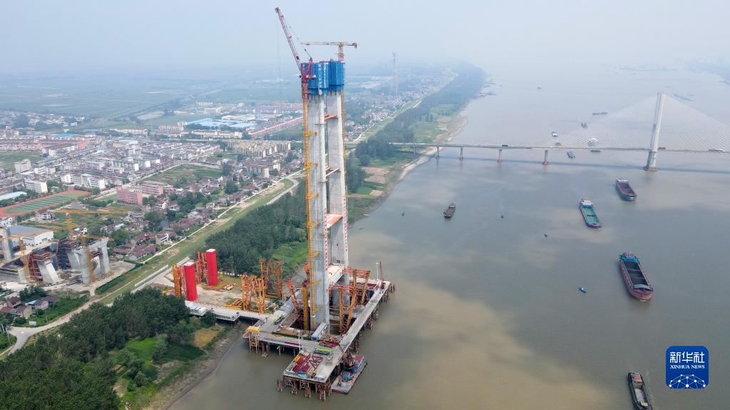 8月18日拍攝的封頂完成的京臺高速銅陵長江公鐵大橋3號主塔(無人機照片)。