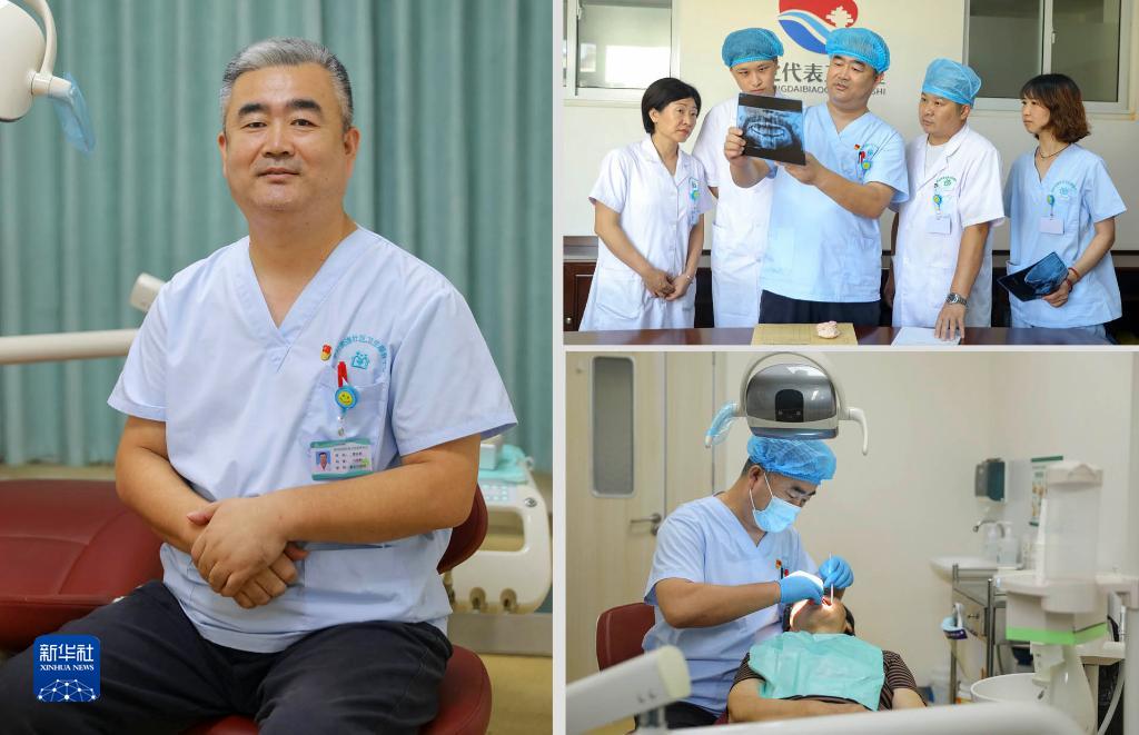 這是山東省青島市李滄區李村街道社區衛生服務中心口腔科副主任醫師賈兆群,從醫31年(拼版照片,均為8月17日攝)。左圖為賈兆群在山東省青島市李滄區李村街道衛生服務中心口腔科留影;右上圖為賈兆群(左三)和同事們研討病例;右下圖為賈兆群在給患者進行口腔修復治療。