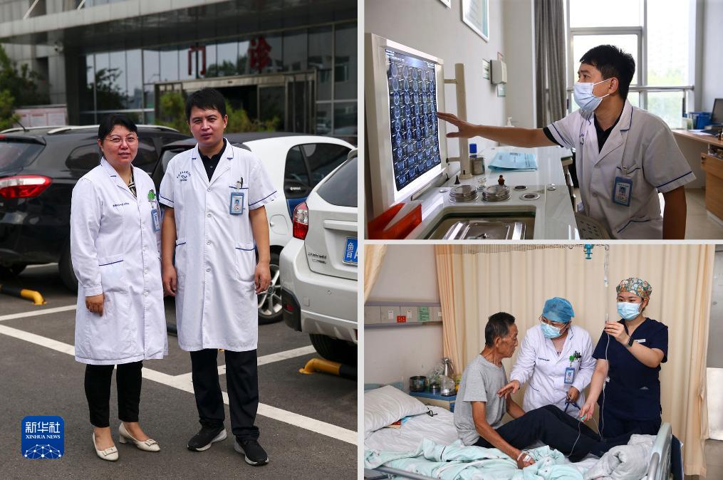 這是山東省濟南市市中區人民醫院科耳鼻喉科主治醫生許錫博和他的妻子、呼吸科主治醫生馮玉鈺,兩人均從醫16年(拼版照片)。左圖為許錫博和馮玉鈺夫妻在醫院門診樓前留影(8月18日攝);右上圖為許錫博在辦公室查看病人CT片(8月17日攝);右下圖為馮玉鈺(左二)在病房與病人交談了解病情(8月17日攝)。