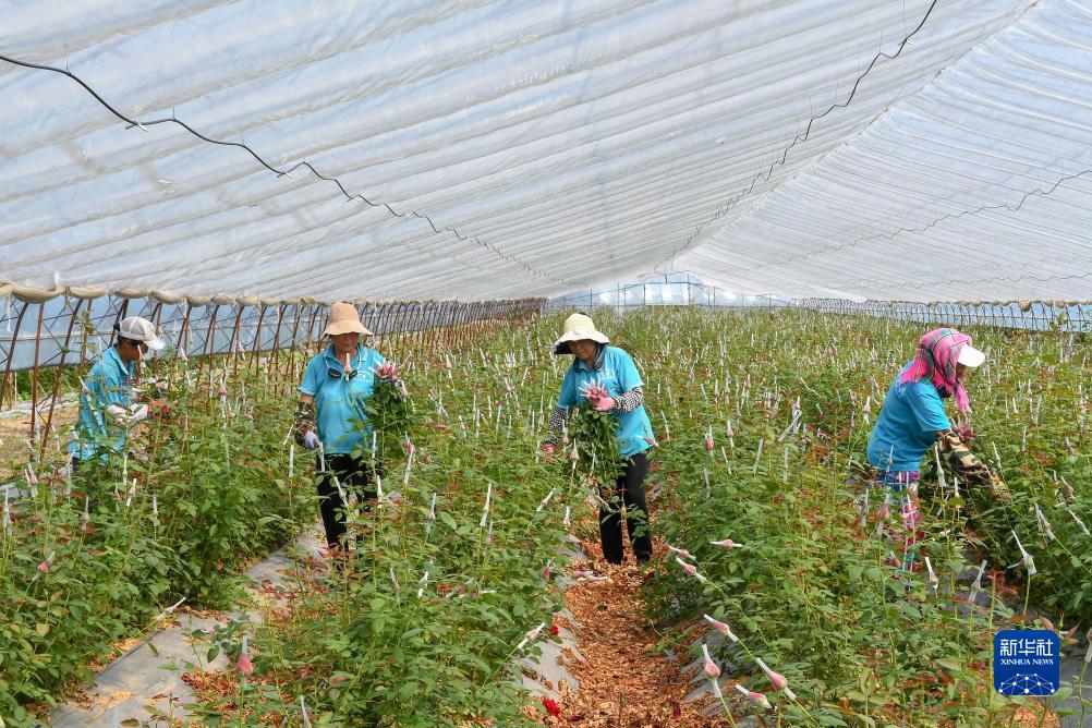 8月17日,農民在吉林省德惠市朱城子鎮沿河村程雪家庭農場采摘玫瑰花。