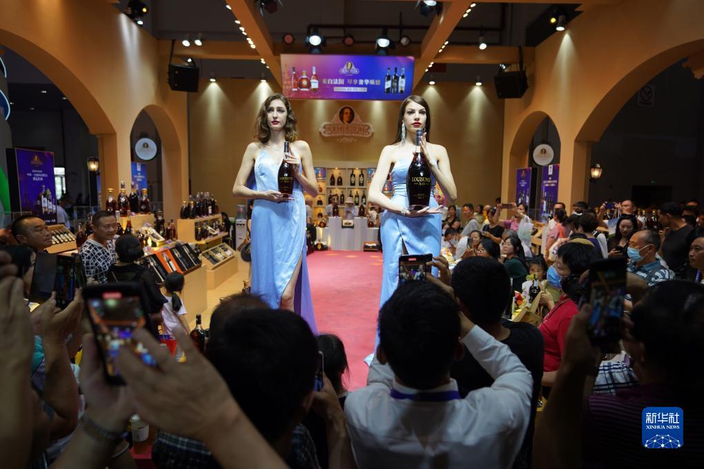 模特在法國(guó)展位上展示白蘭地(8月17日攝)。