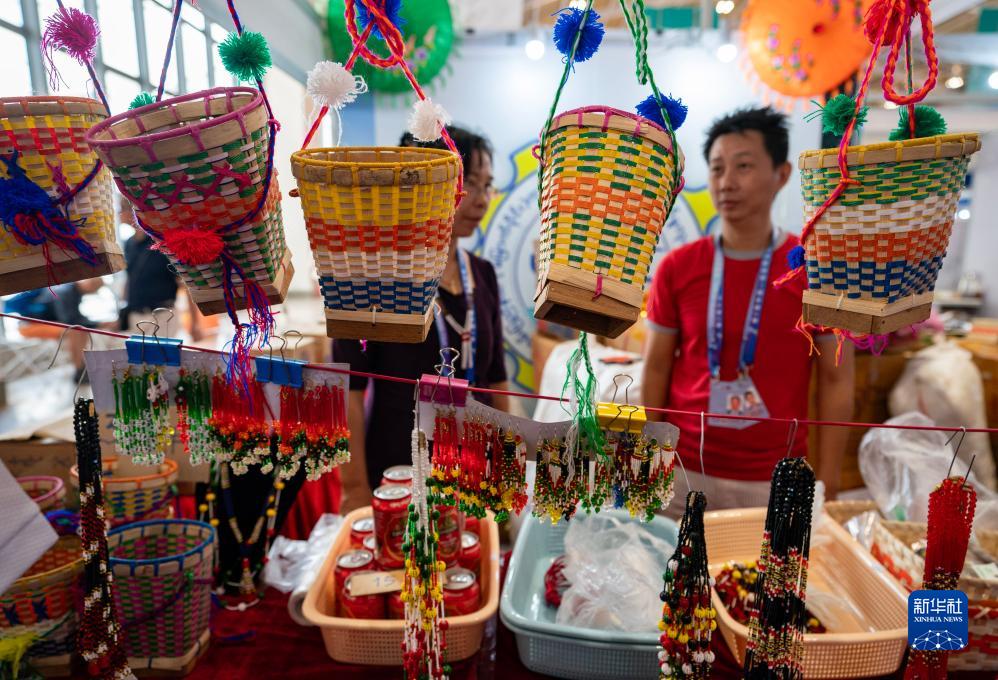 這是8月18日在緬甸展區拍攝的竹編工藝品。