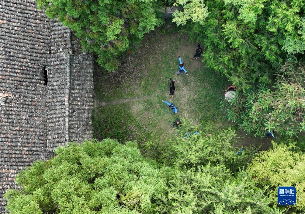 8月18日,舍米湖村村民在有著數百年歷史的“擺手堂”前跳起擺手舞(無人機照片)。