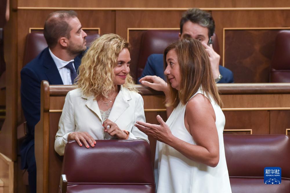 8月17日,在西班牙馬德里,西班牙議會新任議長弗朗西娜·阿門戈爾(右)與前任議長梅麗特克塞爾·巴泰特在議會交談。