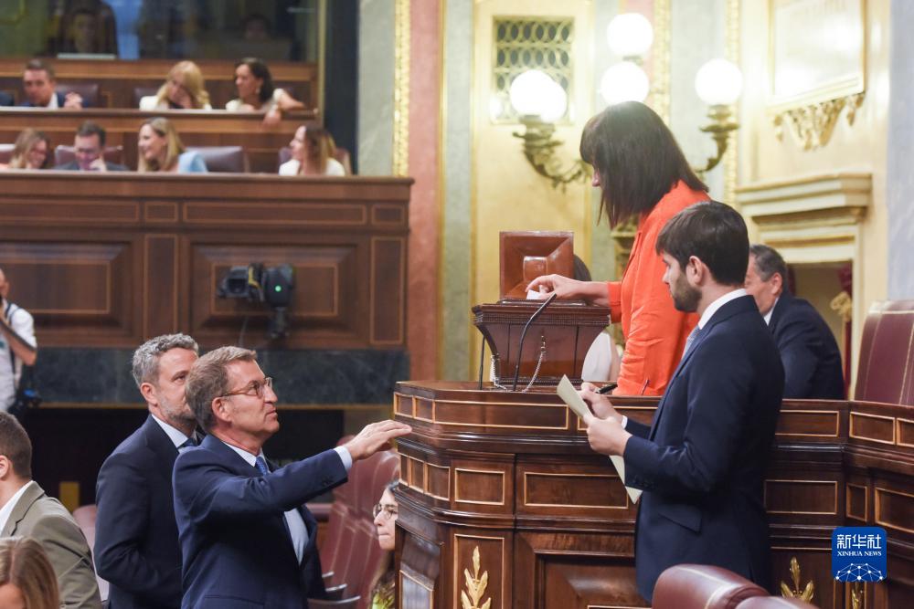 8月17日,在西班牙馬德里,人民黨領(lǐng)導(dǎo)人阿爾韋托·努涅斯·費霍(前左)在議會進(jìn)行投票。