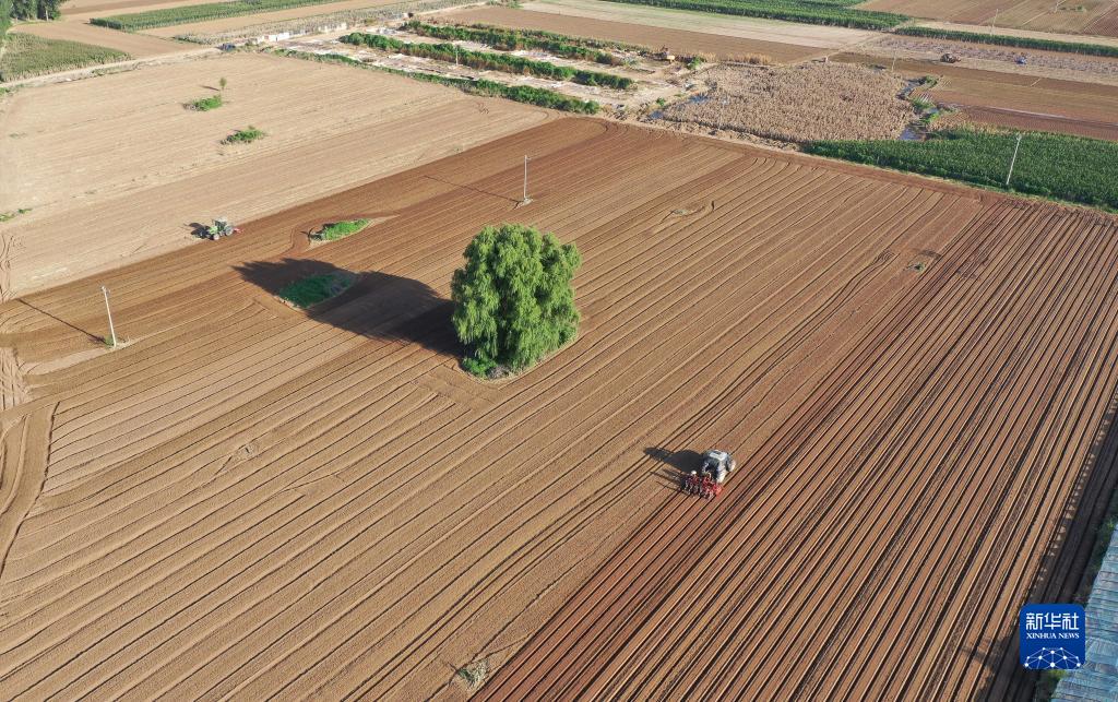 8月18日,農業機械在涿州市刁窩鎮潘各莊村進行復耕補種作業(無人機照片)。