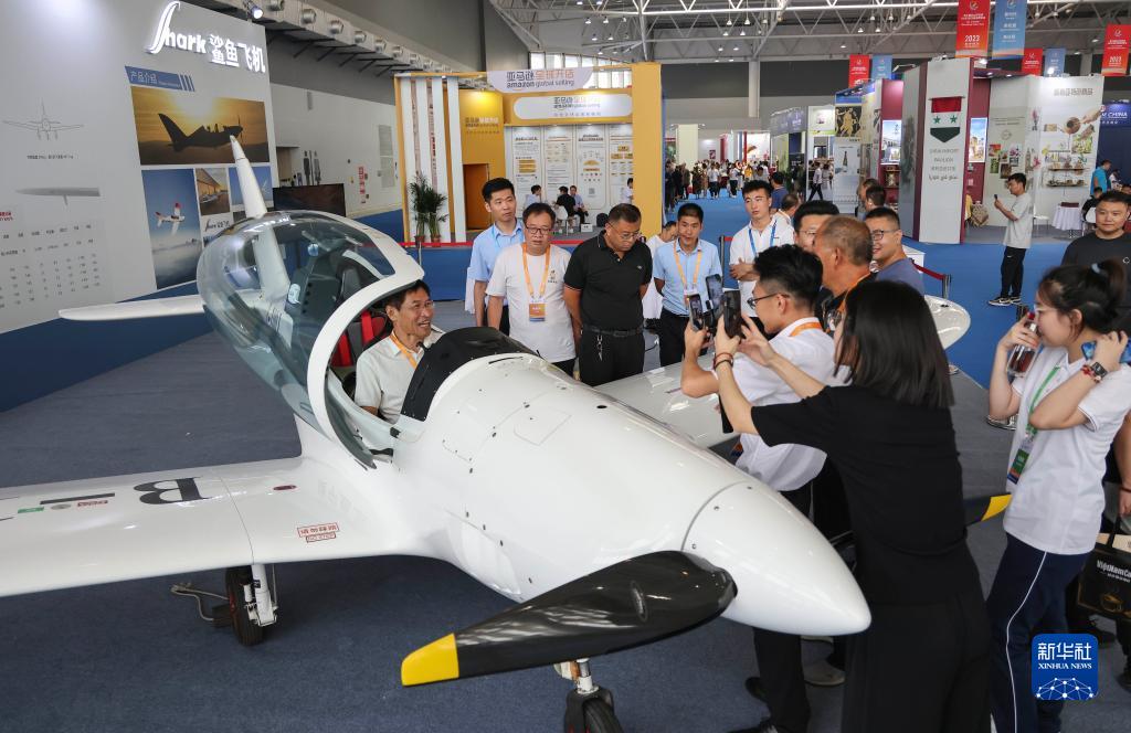 8月18日,客商在第三屆RCEP區(qū)域(山東)進(jìn)口商品博覽會上了解體驗(yàn)一款國產(chǎn)小飛機(jī)。