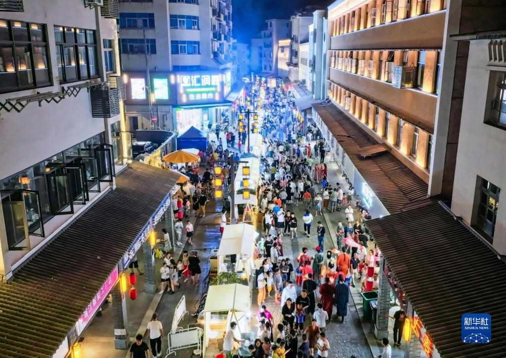 8月18日,在杭州市臨安區昌化鎮,“唐昌之夜”主題文化節正在舉行,吸引眾多游客游玩(無人機照片)。