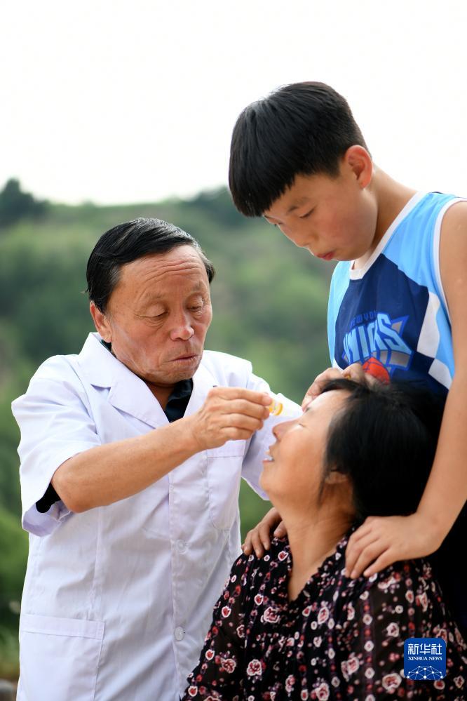 在石樓縣龍交鄉王家溝村蒼墕自然村,村醫楊興榮為村民滴眼藥水(8月15日攝)。