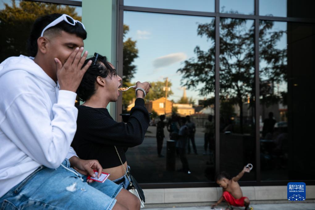 8月17日,移民在美國伊利諾伊州芝加哥第9區警察局外吃飯。